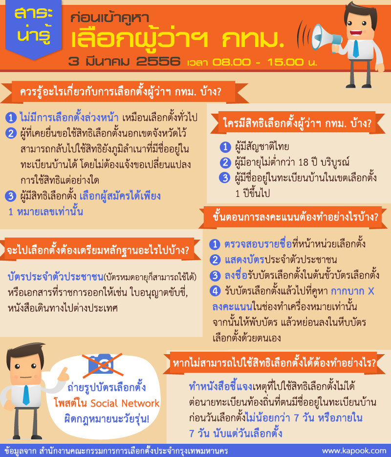 ทั้งนี้ ก่อนจะเข้าคูหาเลือกผู้สมัครผู้ว่าฯ กทม. ที่ชื่นชอบ กระปุกดอทคอม ขอนำเกร็ดข้อมูลเล็ก ๆ น้อย ๆ เกี่ยวกับการเลือกตั้งครั้งนี้ พร้อมทั้งข้อควรรู้ และข้อห้ามมาบอกกัน จะได้เข้าใจขั้นตอนที่ถูกต้อง และ 1 คะแนนเสียงของเราจะได้ไม่กลายเป็นบัตรเสียค่ะ