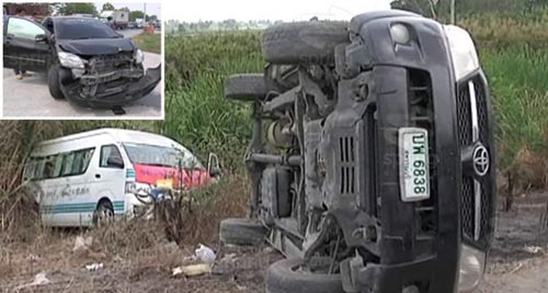 นักศึกษา วัย 19 ปี เพิ่งหัดขับรถได้ 5 เดือน ตกใจรถตู้โดยสารขับปาดหน้า จึงเสยท้ายรถตู้กระเด็นไปชนรถกระบะของแม่ค้าที่ขายของอยู่ข้างทางจนพลิกตะแคง ก่อนที่รถตู้จะตกข้างทาง เป็นเหตุให้มีผู้ได้รับบาดเจ็บ 7 ราย