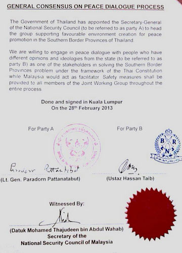"ฉันทามติทั่วไป ว่าด้วยกระบวนการสานเสวนาสันติภาพรัฐบาลแห่งประเทศไทย ได้แต่งตั้งให้เลขาธิการสภาความมั่นคงแห่งชาติ (ต่อแต่นี้จะเรียกว่าฝ่าย A) เป็นหัวหน้าคณะสนับสนุนให้เกิดสภาพแวดล้อม อันเอื้ออำนวยแก่การเสริมสร้างสันติภาพในเหล่าจังหวัดชายแดนภาคใต้ของประเทศไทย เรายินดีที่จะร่วมสานเสวนาสันติภาพกับผู้คนที่มีความคิดเห็นและอุดมการณ์ที่แตกต่างจากรัฐ (ต่อแต่นี้จะเรียกว่าฝ่าย B) ในฐานะผู้มีส่วนได้เสียฝ่ายหนึ่งในการแก้ไขปัญหาจังหวัดชายแดนภาคใต้ภายใต้กรอบของรัฐธรรมนูญไทย ขณะที่ มาเลเซีย จะคอยอำนวยความสะดวก จะมีการจัดหามาตรการรักษาความปลอดภัยแก่บรรดาสมาชิกคณะทำงานร่วมตลอดกระบวนการนี้"