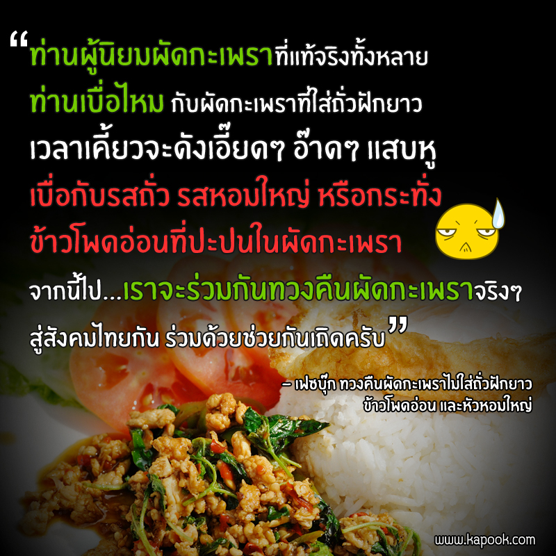 "ต่อไปนี้ให้พ่อแม่พี่น้องช่วยกันโพสต์ผัดกะเพราร้านที่ใส่ถั่วฝักยาว ใส่ข้าวโพดอ่อน ใส่หอมใหญ่ หรือใส่อะไรแปลกปลอมอย่างอื่น มาไว้ในกระทู้นี้ด้วย เพราะถือว่าเท่ากับการทรยศอาหารประจำชาติครับ มีเบาะแสร้านไหน ทรยศผัดกะเพรา ระบุร้าน พิกัดมาได้เลย ช่วยกันทวงคืนความเป็นธรรมของผัดกะเพราคืนมา... ทั้ง กทม. ปริมณฑล และต่างจังหวัด"