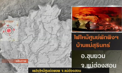 ไฟป่าลุกลามเข้าไหม้ศูนย์พักพิงผู้หลบหนีภัยจาการสู้รบบ้านแม่สุริน ต.ขุนยวม อ.ขุนยวม บ้านพักเสียหายกว่า 200 หลังคาเรือน เสียชีวิตและบาดเจ็บหลายราย