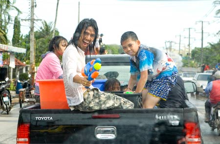 ในกรณีเกิดอุบัติเหตุ จนมีผู้ได้รับบาดเจ็บ และมีผู้เสียชีวิตด้วย : ผู้ฝ่าฝืน มีความผิดฐานประมาทจนทำให้ผู้อื่นได้รับบาดเจ็บ และถึงแก่ความตาย4. ห้ามนั่งหรือยืนบนหลังกระบะเพื่อเล่นน้ำสงกรานต์