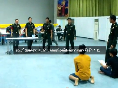อย่างไรก็ตาม ในขณะที่เหลือผู้รอจับสลากอีกไม่ถึงสิบคน และยังเหลือใบแดงอีก 4 ใบ พี่ ๆ เจ้าหน้าที่ทหารเกิดนึกสนุกอยากแกล้งน้องเสื้อเหลือง เลยบอกกับเขาว่า จริง ๆ ยังเหลือใบแดงอีก 5 ใบ เมื่อการจับสลากผ่านไปเรื่อย ๆ จนเหลือเพียง 3 คนสุดท้าย ปรากฏว่า ชายคนแรกที่ลุกไปจับได้ใบแดง ทำเอาน้องเสื้อเหลืองลุ้นจนตัวโก่ง เพราะเข้าใจว่ายังเหลือใบแดง 1 ใบ และเหลือใบดำอีก 1 ใบ (แต่จริง ๆ คือเหลือแต่ใบดำเท่านั้น เพราะพี่ ๆ ทหารหลอกไว้)