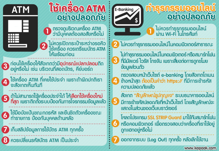 นี่คือเหตุการณ์ตัวอย่างที่เกิดขึ้นจากฝีมือของกลุ่มมิจฉาชีพในโลกออนไลน์ ซึ่งผู้เสียหายต่างแจ้งความไว้เป็นที่เรียบร้อยแล้ว แต่ก็ยังไม่มีบทสรุปว่าจะจบลงอย่างไร และใครต้องรับผิดชอบต่อเรื่องนี้ อย่างไรก็ตาม เพื่อเป็นการเตือนให้ผู้ที่ใช้บริการบัตรเอทีเอ็ม และทำธุรกรรมทางอินเทอร์เน็ตให้ระมัดระวังตัวเองมากขึ้น กระปุกดอทคอม มีวิธีการป้องกันตัวเองจากการใช้บัตรเอทีเอ็ม และการทำธุรกรรมออนไลน์ ซึ่งเป็นข้อมูลจากธนาคารมาแนะนำกัน