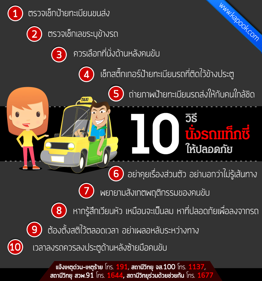 สถานีวิทยุร่วมด้วยช่วยกัน โทร. 1677ต่อจากนี้ไป หากคุณสาว ๆ ทั้งหลาย จำเป็นต้องนั่งแท็กซี่เพียงลำพัง ก็อย่าลืมปฏิบัติตามข้อแนะนำข้างต้น เพราะเราไม่มีทางรู้เลยว่า ภัยร้ายต่าง ๆ จะเกิดขึ้นได้เมื่อไร และอีกสิ่งหนึ่งที่เป็นสิ่งสำคัญไม่แพ้กัน คือ ควรมีสติอยู่เสมอ เพื่อให้สามารถรับมือกับสถานการณ์เหล่านั้นได้อย่างทันท่วงที