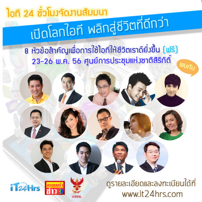กสทช. จึงจัดงานสัมมนา เปิดโลกไอที พลิกสู่ชีวิตที่ดีกว่าโดยไอที24ชั่วโมง ครอบครัวข่าว 3 และสำนักงาน กสทช. 23-26 พฤษภาคม นี้ ในงาน Thailand
