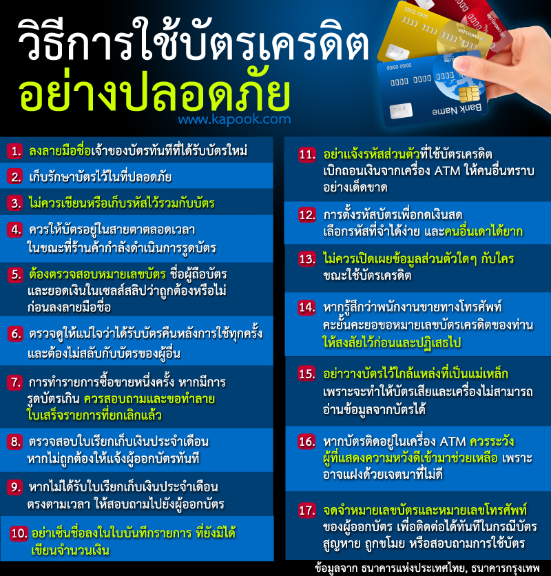 12. ไม่ควรเปิดเผยข้อมูล ส่วนตัวใด ๆ ของท่านกับใครขณะใช้บัตรเครดิต และแสดงบัตรประชาชนหรือเอกสารอื่น ๆ เมื่อท่านเห็นสมควรว่าจำเป็นเท่านั้น