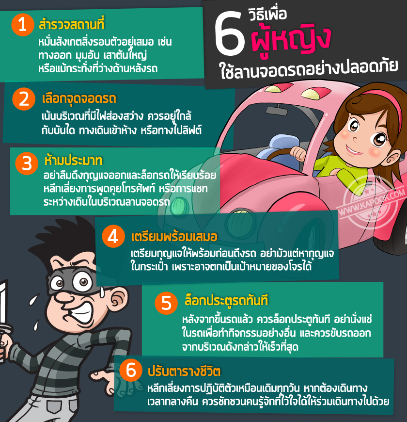 6. ปรับตารางชีวิต : หากสาว ๆ ยังรู้สึกวิตกกังวลว่า ตนเองอาจตกเป็นเป้าหมายของการก่ออาชญากรรม ให้รีบเปลี่ยนกิจวัตรประจำวันที่ทำ เช่น จอดรถในสถานที่ใหม่ จอดรถในเวลาที่แตกต่างจากเดิม โดยหลีกเลี่ยงการปฏิบัติตัวเหมือนเดิมทุกวัน หรือหากต้องเดินทางในเวลากลางคืน ก็ควรชักชวนคนรู้จักที่ไว้ใจได้ให้ร่วมเดินทางไปด้วย นอกจากคำแนะนำเหล่านี้แล้ว สิ่งที่สำคัญที่สุดคือ การรู้จักควบคุมสติให้มั่นในยามคับขัน เพราะถ้าขณะนั้นเรายังมีสติสัมปชัญญะครบถ้วน ก็จะช่วยให้สามารถวิเคราะห์สถานการณ์ได้อย่างรอบคอบ เพื่อถ่วงเวลาหรือหาทางเอาตัวรอดจากเหตุการณ์เลวร้ายที่อาจเกิดขึ้นได้นั่นเอง...