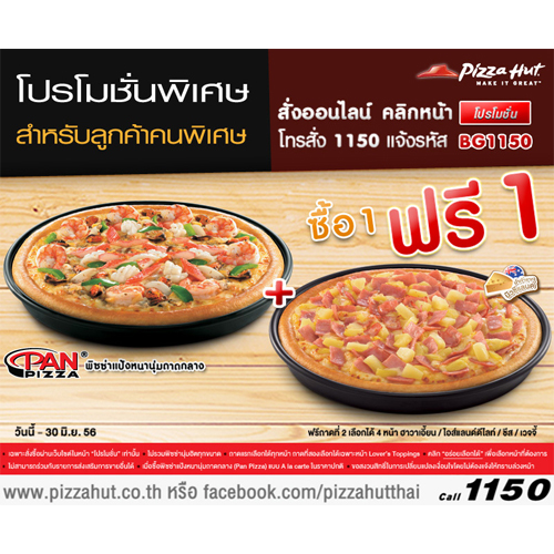 อร่อยสุดคุ้ม! พิซซ่า ฮัท ซื้อ 1 ฟรี 1 คลิกสั่งเลยวันนี้ ถึง 30 มิ.ย. 56 www.pizzahut.co.th/promotion.php หรือโทร 1150 แจ้งรหัส BG1150