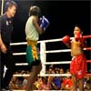 และเมื่อเสียงระฆังดังขึ้น ก็เป็นฝ่ายน้ำเงินที่ตั้งการ์ดได้เป็นมวยเอามาก ๆ บุกตะลุยสาวหมัดเข้าใส่ฝ่ายแดงไม่ยั้ง ทำให้หนุ่มน้อยฝ่ายแดงต้องถอยลูกเดียว กระทั่งถูกเตะเข้าเต็ม ๆ หลังจากชกไปได้แค่ 30 วินาที งานนี้ เจ้าตัวก็เลยร้องไห้จ้าวิ่งเข้ากอดกรรมการขอความช่วยเหลือ แต่ดูเหมือนว่ากรรมการจะไม่ได้ช่วยอะไรเจ้าหนุ่มเลย แถมยังนับใส่อีกต่างหาก จนหนุ่มน้อยส่ายหน้าบอกไม่อยากชกแล้วค้าบ ในที่สุด ก็เลยต้องขอยอมแพ้ลงจากเวทีไป ก่อนที่กรรมการจะชูมือให้ฝ่ายน้ำเงินเป็นผู้ชนะ ท่ามกลางเสียงหัวเราะชอบใจของพี่ป้าน้าอาที่มารอชมรอเชียร์มวยคู่เอกคู่นี้อย่างสนุกสนาน