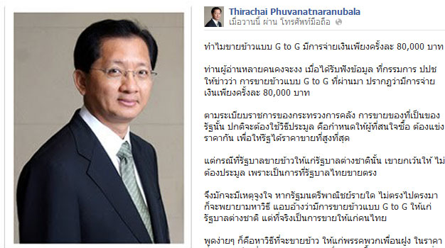 เมื่อวานนี้ (15 กรกฎาคม 2556) เฟซบุ๊ก Thirachai Phuvanatnaranubala ของนายธีระชัย ภูวนาถนรานุบาล อดีตรัฐมนตรีว่าการกระทรวงการคลัง ได้โพสต์ข้อความกล่าวถึงการขายข้าวแบบจีทูจีของรัฐบาล ที่เต็มไปด้วยการทุจริต หลีกเลี่ยงการประมูล เอื้อเฟื้อพรรคพวก และไม่ยอมเปิดเผยข้อมูลที่แท้จริง