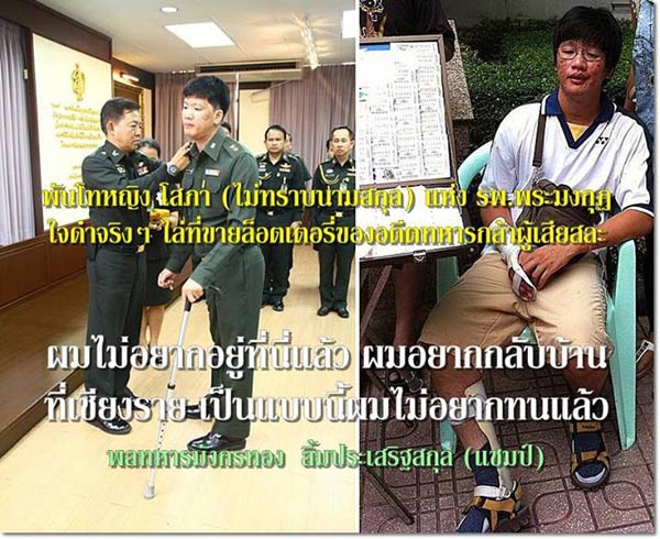 น้องแชมป์ พลทหารมังกรทอง ลิ้มประเสริฐสกุล ทหารผู้พิการจากเหตุการณ์สามจังหวัดชายแดนภาคใต้ ขายลอตเตอรี่หน้าโรงพยาบาลพระมงกุฎเกล้า แต่ถูกพันโทหญิงโสภาไล่ที่