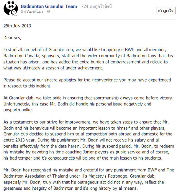 ขณะเดียวกัน ทางสโมสรก็ต้องขอโทษต่อสหพันธ์แบดมินตันโลก และสมาคมแบดมินตันแคนาดา รวมถึงแฟนแบดมินตัน, ผู้สนับสนุน และเจ้าหน้าที่จัดการแข่งขัน เกี่ยวกับเรื่องที่เกิดขึ้น ซึ่งเรื่องดังกล่าวนั้นถือว่าเป็นเรื่องที่น่าอับอายอย่างมาก