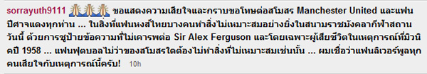 "ขอแสดงความเสียใจและกราบขอโทษต่อสโมสร Manchester United และแฟนปีศาจแดงทุกท่าน ... ในสิ่งที่แฟนหงส์ไทยบางคนทำสิ่งไม่เหมาะสมอย่างยิ่งในสนามราชมังคลากีฬาสถานวันนี้ ด้วยการชูป้ายข้อความที่ไม่เคารพต่อ Sir Alex Ferguson และโดยเฉพาะผู้เสียชีวิตในเหตุการณ์ที่มิวนิคปี 1958 ... แฟนฟุตบอลไม่ว่าของสโมสรใดต้องไม่ทำสิ่งที่ไม่เหมาะสมเช่นนั้น ... ผมเชื่อว่าแฟนลิเวอร์พูลทุกคนเสียใจกับเหตุการณ์นี้ครับ!"
