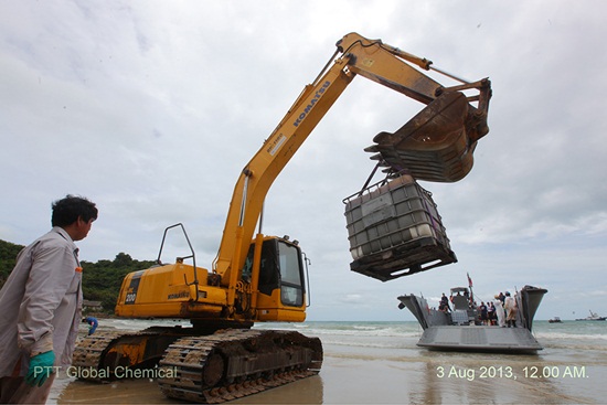 วันนี้ (4 สิงหาคม 2556) นายบวร วงศ์สินอุดม ประธานกรรมการผู้จัดการใหญ่ บริษัท พีทีที โกลบอล เคมิคอล จำกัด (มหาชน) หรือ PTTGC เปิดเผยความคืบหน้าการขจัดคราบน้ำมันบริเวณหาดอ่าวพร้าว จ.ระยอง ว่า ขณะนี้ทางเจ้าหน้าที่ได้นำบิ๊กแบ็กสำหรับเก็บคราบน้ำมันลงเรือเพื่อขนออกจากพื้นที่เรียบร้อยแล้ว เหลือเพียงแต่ถังขนาด 1 คิว ที่มีความล่าช้าจากการขนจากเรือเล็กไปสู่เรือใหญ่ ซึ่งหลังจากเก็บอุปกรณ์เครื่องไม้เครื่องมือเสร็จสิ้น จะมีการเฝ้าระวังเรื่องทำความสะอาดอีกครั้ง ทั้งนี้สิ่งที่น่าเป็นห่วงในขณะนี้คือ ขยะที่มีจำนวนมากจากประชาชน ที่เข้ามาช่วยขจัดคราบน้ำมัน ที่เกรงว่าจะทำให้เกิดความลำบากต่อการจัดการขยะของเกาะ