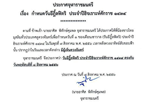 จุฬาราชมนตรี ออกประกาศวันอีฎิ้ลฟิตริ หรือ วันออกบวช อิสลาม 2556 ตรงกับวันที่ 8 สิงหาคม 2556
