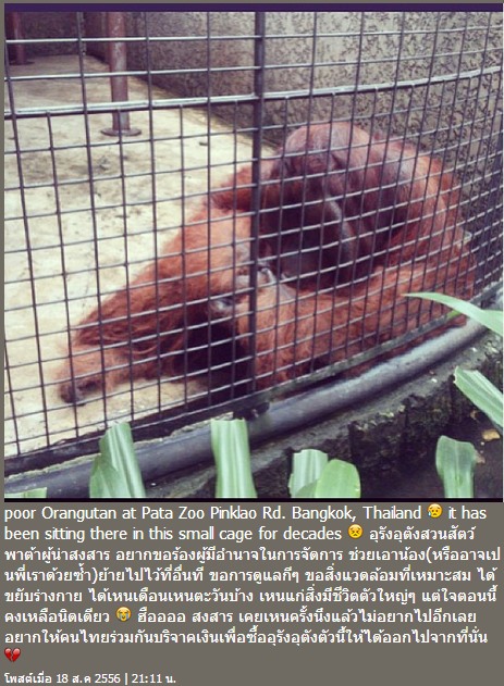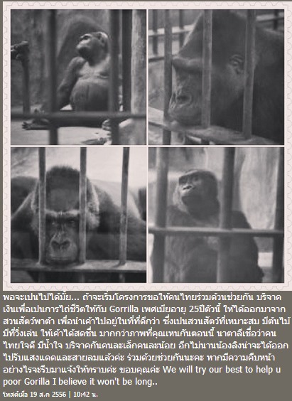 "พอจะเป็นไปได้มั้ย ถ้าจะเริ่มโครงการขอให้คนไทยร่วมด้วยช่วยกัน บริจาคเงินเพื่อเป็นการไถ่ชีวิตให้กับ Gorrilla เพศเมียอายุ 25 ปีตัวนี้ ให้ได้ออกมาจากสวนสัตว์พาต้า เพื่อนำเค้าไปอยู่ในที่ที่ดีกว่า ซึ่งเป็นสวนสัตว์ที่เหมาะสม มีต้นไม้ มีที่วิ่งเล่น ให้เค้าได้สดชื่น มากกว่าภาพที่คุณเห็นกันตอนนี้ นาตาลีเชื่อว่าคนไทยใจดี มีน้ำใจ บริจาคกันคนละเล็กคนละน้อย อีกไม่นานน้องลิงน่าจะได้ออกไปรับแสงแดดและสายลมแล้วค่ะ ร่วมด้วยช่วยกันนะคะ หากมีความคืบหน้าอย่างไรจะรีบมาแจ้งให้ทราบค่ะ ขอบคุณค่ะ We will try our best to help u poor Gorilla I believe it won't be long"