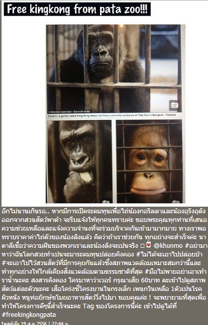 ล่าสุด (19 สิงหาคม 2556) ในโลกออนไลน์ก็ได้มีการแชร์ภาพกอริลลาและสัตว์ที่สวนสัตว์ดังกล่าวผ่านทางโซเชียลเน็ตเวิร์กโดยเฉพาะในอินสตาแกรม พร้อมระบุข้อความให้มีการช่วยเหลือสัตว์ต่าง ๆ ในสวนสัตว์พาต้าออกมาจากสภาพแวดล้อมที่ย่ำแย่ สกปรก ขาดการดูแล จนทำให้สัตว์บางตัวป่วยเป็นโรค เซื่องซึมและผอมโซ โดยมีการแท็ก #freekingkongpata เพื่อให้ภาพทั้งหมดอยู่รวมกัน