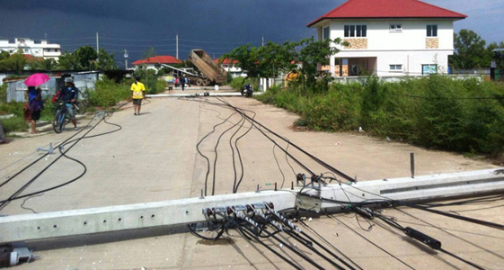 เกิดเหตุรถบรรทุกเกี่ยวเสาไฟฟ้าล้มกว่า 7 ต้น บริเวณ ซ.บ้านพัก ถ.ประชาอุทิศ-คู่สร้าง จ.สมุทรปราการ ส่งผลให้กระแสไฟฟ้าเป็นอัมพาตทั้งซอย รถยนต์เสียหาย 2 คัน และมีผู้ได้รับบาดเจ็บสาหัส 1 ราย