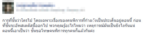"การที่ฉันว่าใครไป โดยเฉพาะเรื่องของคนพิการที่กำลังเป็นประเด็นอยู่ตอนนี้ ก่อนที่ฉันจะอัพสเตตัสนี้ออกไป พวกคุณรู้อะไรไหมว่า เหตุการณ์มันเป็นยังไงกันแน่ ตอนนี้เอาเป็นว่า ฉันขอโทษคนพิการทุกคนก็แล้วกันค่ะ"
