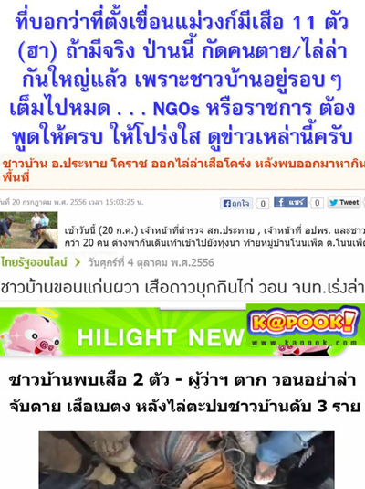 {5} ถ้ามีเสือแถวที่จะสร้างเขื่อนแม่วงก์จริง ป่านนี้มีข่าวเช่นนี้แล้ว ชาวบ้านคงผวานอนไม่หลับ ออกล่าเสือ . . . ชาวบ้าน อ.ประทาย โคราช ออกไล่ล่าเสือโคร่ง หลังพบออกมาหากินในพื้นที่ (matichon.co.th) วอนอย่าล่า เสือ 2 ตัว หลังชาวบ้านพบใน ป่าชุมชนโป่งแดง (kapook.com) เสือเบตง สิ้นฤทธิ์ จับตายเสือเบตง หลังตะปบชาวบ้านดับ 3 ราย (kapook.com) ชาวบ้านขอนแก่นผวา เสือดาวบุกกินไก่ วอน จนท.เร่งล่า (thairath.co.th)