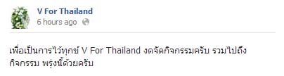 วันนี้ (25 ตุลาคม 2556) เฟซบุ๊ก V For Thailand ของกลุ่มหน้ากากขาว มีการเขียนข้อความหลังจากที่ สมเด็จพระญาณสังวร สมเด็จพระสังฆราช สกลมหาสังฆปริณายก ได้สิ้นพระชนม์เมื่อวานนี้ (24 ตุลาคม) ว่า เพื่อเป็นการไว้ทุกข์แด่สมเด็จพระสังฆราชฯ ทางกลุ่ม V for Thailand จึงประกาศเลื่อนจัดกิจกรรมทุกอย่างออกไปก่อน