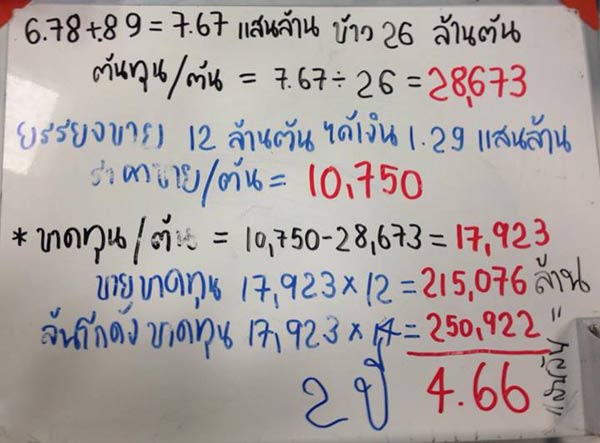 จำนวนเงินขาดทุน 17,923 บาท X 12 ล้านตัน = 215,076 ล้านบาท