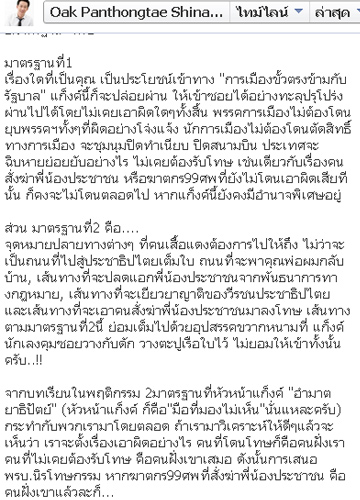 โอ๊ค พานทองแท้ ชินวัตร โพสต์เฟซบุ๊ก ชี้ พ.ร.บ.กลางซอย เอาผิดคนสั่งฆ่าประชาชนไม่ได้ ยินดีคุย หากแดงไม่สบายใจเรื่องเอา ทักษิณ ชินวัตร กลับบ้าน ขอเพื่อไทยอย่าแตกเสื้อแดง พร้อมช่วยประสาน