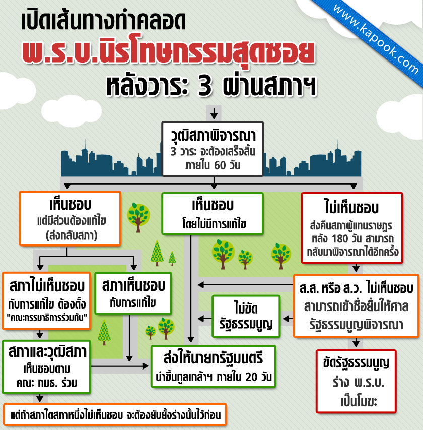 อย่างไรก็ตาม แม้ร่าง พ.ร.บ.นิรโทษกรรม ที่ถูกเรียกขานกันว่าเป็น "นิรโทษกรรมสุดซอย" จะผ่านความเห็นชอบของที่ประชุมสภาฯ ในวาระที่ 3 ไปแล้ว แต่ก็ไม่ได้หมายความว่า กฎหมายฉบับนี้จะมีผลใช้ได้ทันที เพราะยังมีอีกหลายขั้นตอนกว่าที่จะทำคลอดกฎหมายฉบับนี้ออกมาได้สำเร็จ ดังนี้