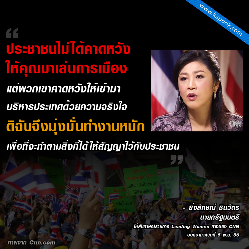 เมื่อวันที่ 5 พฤศจิกายน 2556 สำนักข่าวซีเอ็นเอ็น เปิดเผยคลิปวิดีโอสกู๊ปของสำนักข่าวซีเอ็นเอ็น ที่เผยเรื่องราวของนางสาวยิ่งลักษณ์ ชินวัตร กับบทบาทหน้าที่การเป็นนายก พร้อมเผยบทสัมภาษณ์ "ดิฉันได้พิสูจน์ตัวเองแล้วว่าไม่ได้เป็นหุ่นเชิดของใคร"