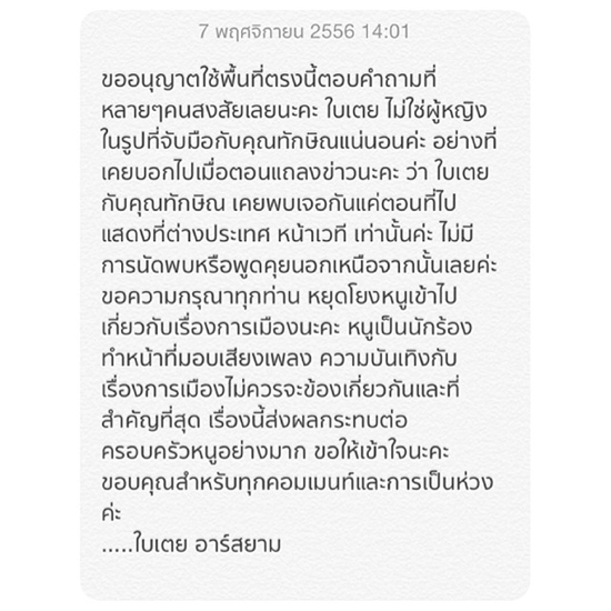 "ขออนุญาตใช้พื้นที่ตรงนี้ตอบคำถามที่หลาย ๆ คนสงสัยเลยนะคะ ใบเตย ไม่ใช่ผู้หญิงในรูปที่จับมือกับคุณทักษิณแน่นอนค่ะ อย่างที่เคยบอกไปเมื่อตอนแถลงข่าวนะคะ ว่า ใบเตยกับคุณทักษิณ เคยพบเจอกันแค่ตอนที่ไปแสดงที่ต่างประเทศ หน้าเวที เท่านั้นค่ะ ไม่มีการนัดพบหรือพูดคุยนอกเหนือจากนั้นเลยค่ะ ขอความกรุณาทุกท่าน หยุดโยงหนูเข้าไปเกี่ยวกับการเมืองนะคะ หนูเป็นนักร้องทำหน้าที่มอบเสียงเพลง ความบันเทิงกับเรื่องการเมืองไม่ควรจะข้องเกี่ยวกัน และที่สำคัญที่สุด เรื่องนี้ส่งผลกระทบต่อครอบครัวหนูอย่างมาก ขอให้เข้าใจนะคะ ขอบคุณสำหรับทุกคอมเมนท์และการเป็นห่วงค่ะ