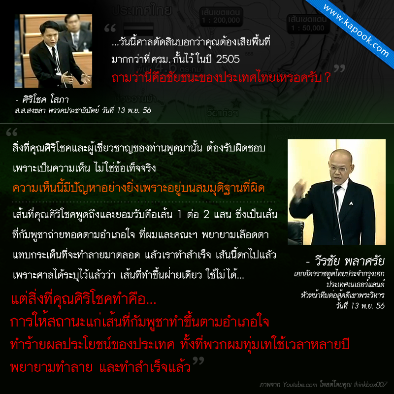 แต่ตนขอแย้งว่า สิ่งที่นายศิริโชคและผู้เชี่ยวชาญของท่านพูดมานั้น ต้องรับผิดชอบ เพราะเป็นความเห็นไม่ใช่ข้อเท็จจริง ความเห็นนี้มีปัญหาอย่างยิ่งเพราะอยู่บนสมมติฐานที่ผิด ผิดตั้งแต่ก้าวออกจากบ้าน เส้นที่นายศิริโชคพูดถึงและยอมรับคือเส้น 1 ต่อ 200,000 ซึ่งเป็นเส้นที่กัมพูชาถ่ายทอดตามอำเภอใจ เป็นเส้นที่ทีมงานเราพยายามอย่างหนักเลือดตาแทบกระเด็นที่จะทำลายมาตลอด จนในที่สุดเราก็ทำสำเร็จ เส้นนี้ตกไปแล้ว เพราะศาลได้ระบุไว้ในคำพิพากษาตามวรรค 99 แล้วว่า เส้นที่ทำขึ้นฝ่ายเดียว ใช้ไม่ได้