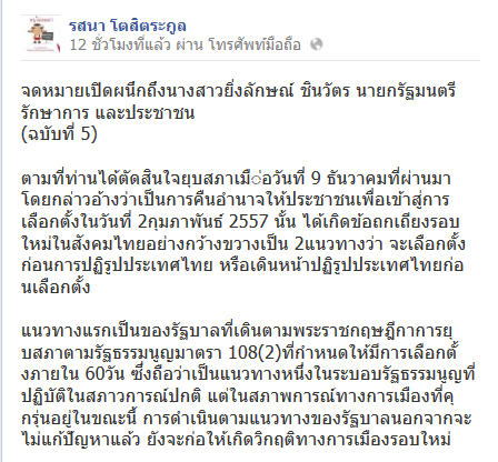 เมื่อวันที่ 14 ธันวาคม 2556 น.ส.รสนา โตสิตระกูล สมาชิกวุฒิสภากรุงเทพมหานคร โพสต์เฟซบุ๊ก รสนา โตสิตระกูล เขียนจดหมายเปิดผนึกถึงนางสาวยิ่งลักษณ์ ชินวัตร นายกรัฐมนตรีรักษาการ และประชาชน (ฉบับที่ 5) แนะให้ น.ส.ยิ่งลักษณ์ และทักษิณ ชินวัตร วางมือทางการเมือง พร้อมเสนอ 5 ข้อเลี่ยงความรุนแรง สำหรับเนื้อหาระบุดังนี้