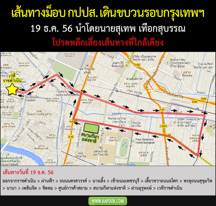 - วันที่ 19 ธันวาคม ทางกลุ่มผู้ชุมนุมจะทานอาหารเช้า แล้วเดินจากราชดำเนินไปผ่านฟ้า ถนนนครสวรรค์ ผ่านนางเลิ้ง เข้าถนนเพชรบุรี เลี้ยวขวา ถนนอโศก ไปทะลุ ถนนสุขุมวิท แวะทานอาหารกลางวันที่ปลาย ถนนอโศกตัดสุขุมวิท และล่องถนนสุขุมวิทกลับมาผ่าน นานา เพลินจิต ชิดลม ศูนย์การค้าสยาม ผ่านอุรุพงษ์ แล้วมาฟังปราศรัยที่เวทีราชดำเนินเหมือนเดิม