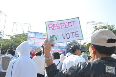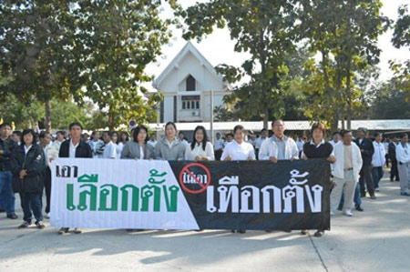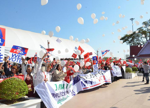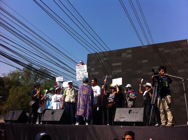 10.15 น. ม็อบเสื้อแดง-เสื้อขาว รวมตัวกว่า 3 พันคนชูป้ายคัดค้านสุเทพ ไม่เอาปฏิวัติ-กปปส. สนับสนุนการเลือกตั้ง