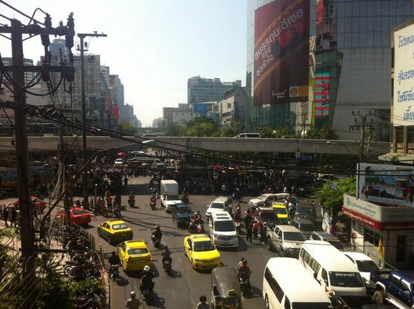 07.35 น. ม็อบ กปปส. ที่แยกราชประสงค์ คึกคักแต่เช้า ขณะที่การจราจรถนนพระรามที่ 1 ตั้งแต่แยกราชประสงค์ จนถึงแยกอังรีดูนังต์ ฝั่ง สตช. ยังเปิดให้รถผ่านได้ ตำรวจคุมเข้ม