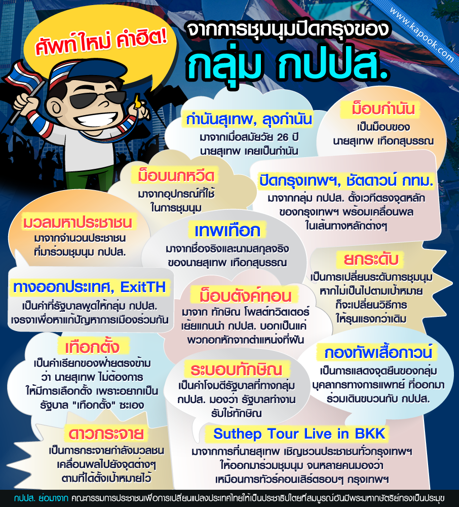 เรียบเรียงข้อมูลโดยกระปุกดอทคอม คำศัพท์ใหม่ ที่ได้ยินบ่อย ๆ ในการชุมนุมทางการเมือง กปปส. ทั้งม็อบนกหวีด มวลมหาประชาชน ลุงกำนันฯ กลายเป็นคำศัพท์ใหม่ที่คุ้นหูประชาชนไปซะแล้ว สำหรับคำศัพท์ที่เกี่ยวกับเหตุการณ์ทางการเมือง ซึ่งนับวันจะมีคำใหม่ ๆ ผุดออกมาให้เราได้ยินได้ฟังกันตลอด เอ..ว่าแต่ว่า คำศัพท์ใหม่ ๆ จะมีคำอะไรบ้างนะ แล้วแต่ละคำเขาหมายถึงอะไร วันนี้เรารวบรวมมาฝากกันค่ะ