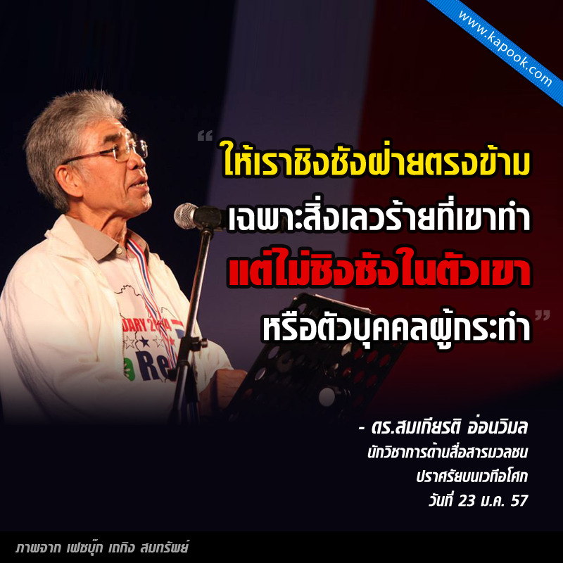 เมื่อคืนวันที่ 23 มกราคม 2557 ดร.สมเกียรติ อ่อนวิมล นักวิชาการด้านสื่อสารมวลชน ได้แสดงจุดยืนทางการเมือง ด้วยการขึ้นปราศรัยบนเวที กปปส. อโศก เป็นครั้งแรก ซึ่งได้รับความสนใจจากมวลชนเป็นอย่างมาก