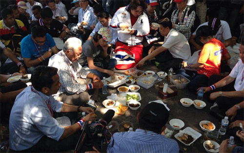 11:53 สุเทพ พร้อมขบวน กปปส. แวะพักทานอาหารกลางวัน ใต้ต้นไทร อาคารเมืองไทยประกันชีวิต รัชดา