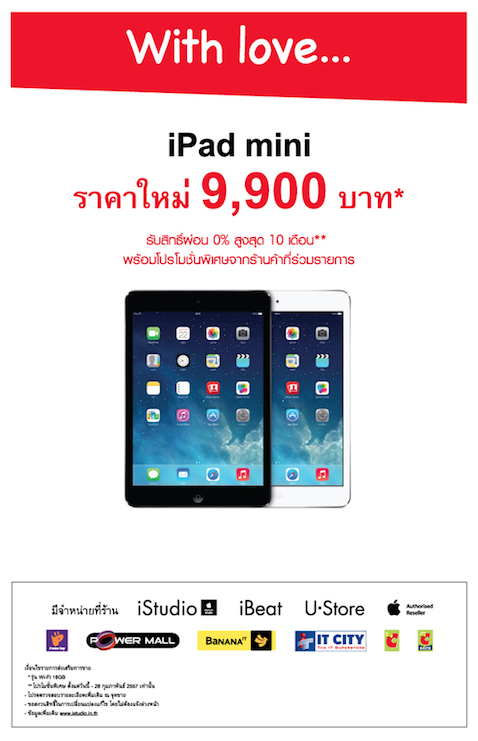 โปรโมชั่นพิเศษในเดือนแห่งความรัก กับ iPad Mini ราคาใหม่ 9,900 บาท* รับสิทธิ์ผ่อน 0% สูงสุด 10 เดือน** วันนี้ - 28 ก.พ. 2557 เท่านั้น