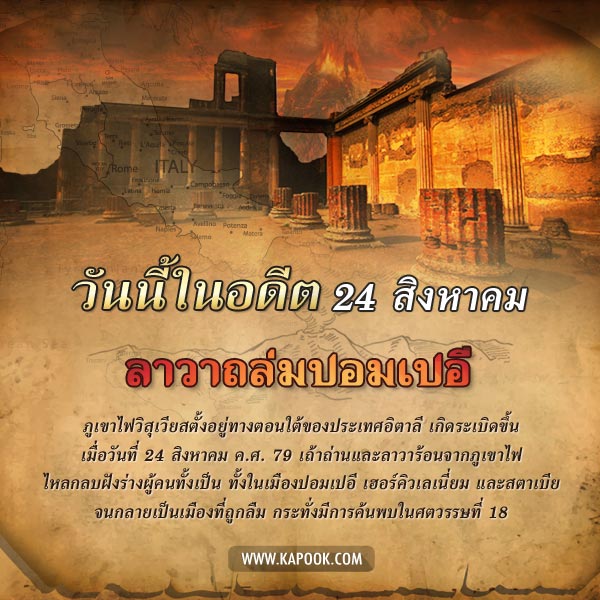 กระทั่งขณะนี้เวลาได้ผ่านไปนาน 1,937 ปีแล้ว นับตั้งแต่เกิดเหตุภูเขาไฟวิสุเวียสระเบิดในครั้งนั้น ในวันนี้ (24 สิงหาคม 2559) เราจึงขอพาทุกคนย้อนกลับไปดูเหตุการณ์วันนี้ในอดีตกันอีกครั้ง