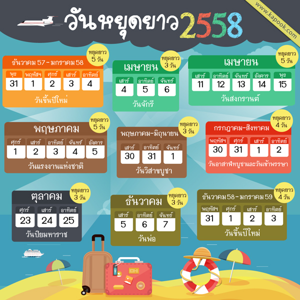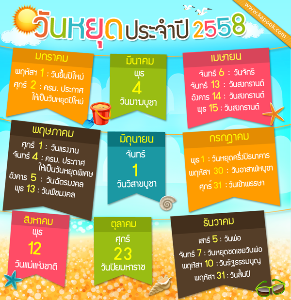 วันหยุด 2558 ปฏิทินวันหยุด 2558 วันหยุดยาว 2558 มีวันไหนบ้าง วันนี้เรามี ปฏิทินวันหยุด 2558 ทั้งวันหยุดราชการไทย รวมไปถึงวันหยุดตามธนาคารมาฝาก