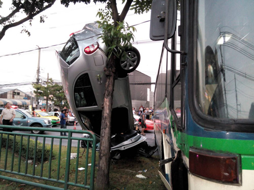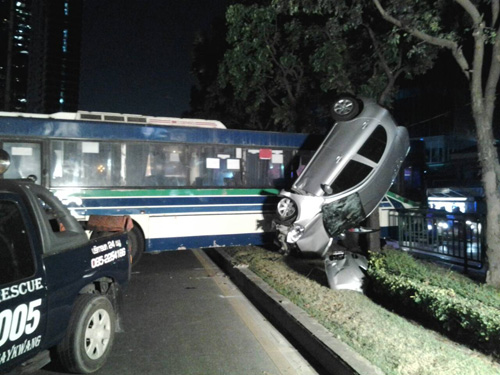 รถเมล์คันเร่งค้าง พุ่งเสยรถเก๋งตีลังกาคารั้วกลางถนน บริเวณหน้าเอสพลานาด รัชดา ไร้เจ็บ