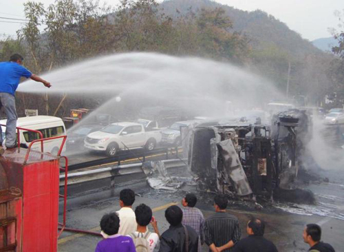 จากการสอบสวนเบื้องต้น ทราบว่า รถคันดังกล่าว กำลังจะนำน้ำมันไปส่งที่ จ.เชียงใหม่ แต่เมื่อมาถึงที่เกิดเหตุ ซึ่งเป็นทางโค้งลงเนิน เกิดเสียหลักพลิกคว่ำและไฟได้ลุกท่วมรถทั้งคันอย่างรวดเร็ว ทำให้มีผู้เสียชีวิตถูกไฟคลอกทันที ส่งผลให้การจราจรเป็นอัมพาตติดกินระยะทางยาวหลายกิโลเมตร เจ้าหน้าที่จึงได้จัดช่องทางระบายรถทางเดียวเพื่อให้ผู้ใช้รถใช้ถนนสามารถเดินทางผ่านไปได้