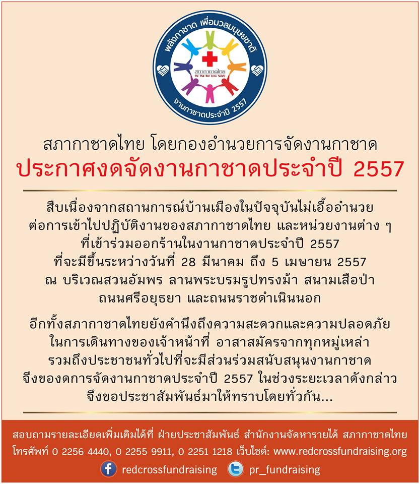 สภากาชาดไทย โดยกองอำนวยการจัดงานกาชาดประจำปี 2557 จึงของดการจัดงานกาชาดประจำปี 2557 ระหว่างวันที่ 28 มีนาคม5 เมษายน 2557 และขอประชาสัมพันธ์มาให้ทราบโดยทั่วกัน