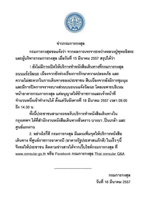 วันนี้ (16 มีนาคม 2557) กรมการกงสุล กระทรวงต่างประเทศ มีการออกประกาศเกี่ยวกับการทำหนังสือเดินทางที่กรมการกงสุล ถ.แจ้งวัฒนะ ว่า ยังไม่มีการเปิดบริการทำหนังสือเดินทางที่กรมการกงสุลแต่อย่างใด เนื่องจากยังเป็นห่วงในเรื่องความปลอดภัย และในบริเวณดังกล่าวยังมีการชุมนุมกันอยู่ อย่างไรก็ตามก็อนุญาตให้ข้าราชการและเจ้าหน้าที่จำนวนหนึ่งสามารถทำงานได้ตั้งแต่วันที่ 18 มีนาคมนี้ ในเวลา 09.00-14.30 น. นอกจากนี้ ทางกรมการกงสุล มีแผนเพิ่มจุดทำหนังสือเดินทางที่ศูนย์ราชการอาคารบี (อาคารัฐประศาสนภักดี) ในเร็ว ๆ นี้ จึงขอให้ประชาชนติดตามข่าวสารได้ที่เว็บไซต์ consular.go.th หรือ เฟซบุ๊ก Thai consular Q&A