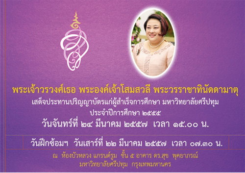 มหาวิทยาลัยศรีปทุม กำหนดวันฝึกซ้อม และพิธีประทานปริญญา แก่ผู้สำเร็จการศึกษาระดับปริญญาโทและเอก มหาวิทยาลัยศรีปทุม ประจำปีการศึกษา 2555 โดยวันฝึกซ้อม วันเสาร์ที่ 22 มีนาคม 2557 รายงานตัว เวลา 07.30 น. ณ จุดรายงานตัว ชั้นล่าง อาคารสยามบรมราชกุมารี (อาคาร 5) และทำการฝึกซ้อมย่อยและฝึกซ้อมใหญ่ ณ ห้องบัวหลวง แกรนด์รูม ชั้น 5 อาคาร ดร.สุข พุคยาภรณ์ (อาคาร 1) และกำหนดพิธีประทานปริญญา แก่ผู้สำเร็จการศึกษา มหาวิทยาลัยศรีปทุม ประจำปีการศึกษา 2555 โดยได้รับประทานพระอนุญาตจาก พระเจ้าวรวงศ์เธอ พระองค์เจ้าโสมสวลี พระวรราชาทินัดดามาตุ เสด็จเป็นองค์ประธานในพิธีฯ ในวันจันทร์ที่ 24 มีนาคม 2557 โดยให้ผู้สำเร็จการศึกษาระดับปริญญาโทและเอก รายงานตัว เวลา 11.00 น. ณ ชั้นล่าง อาคาร ดร.สุข พุคยาภรณ์ (อาคาร 1) มหาวิทยาลัยศรีปทุม บางเขน